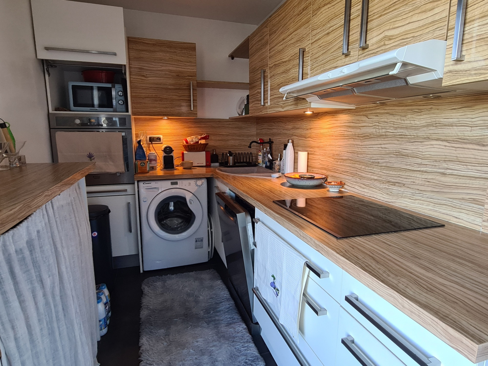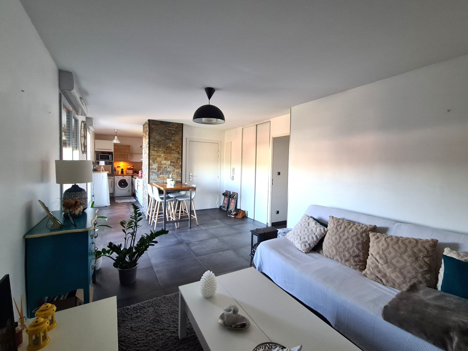 Il se compose d'une entrée avec placard, d'une séjour de 22,66 m², d'une cuisine ouverte très bien équipée, donnant accès à une superbe terrasse de 73 m² avec une vue dégagée sur un bel espace classé en zone verte.