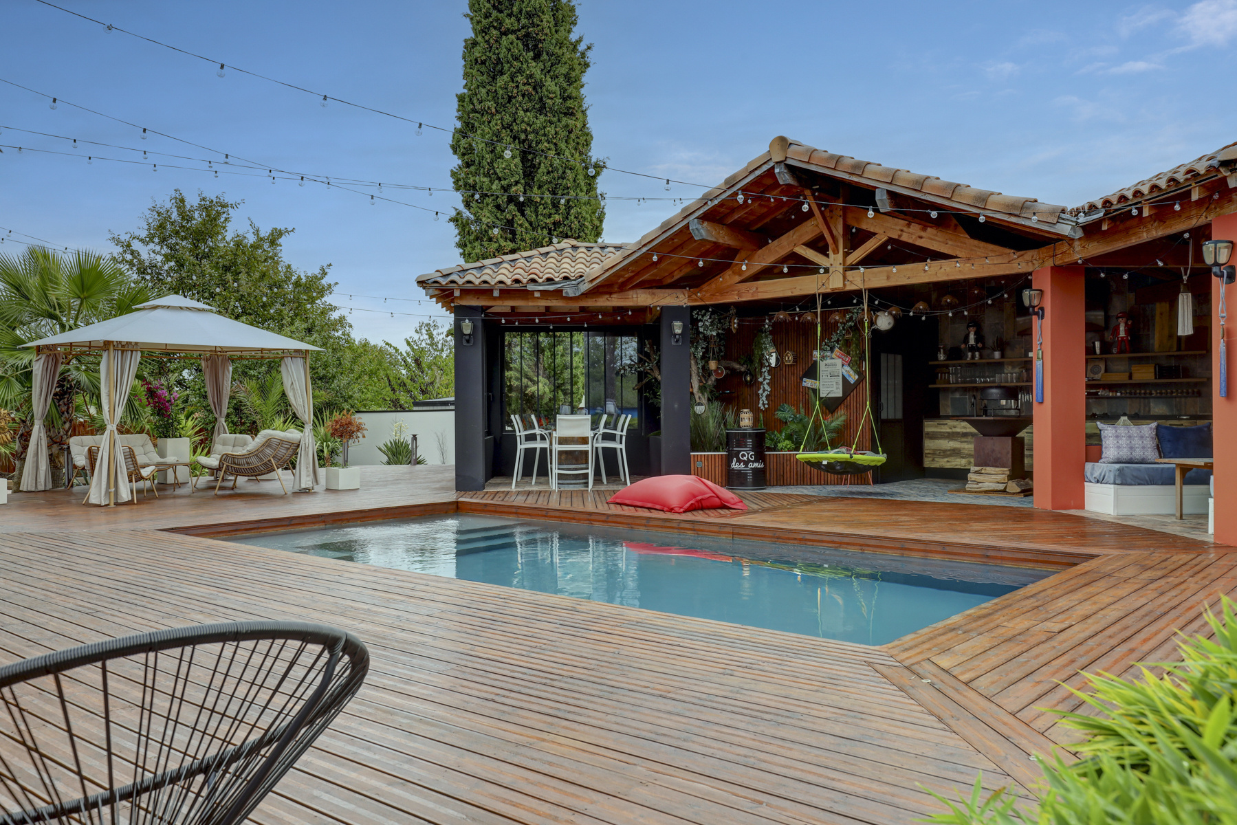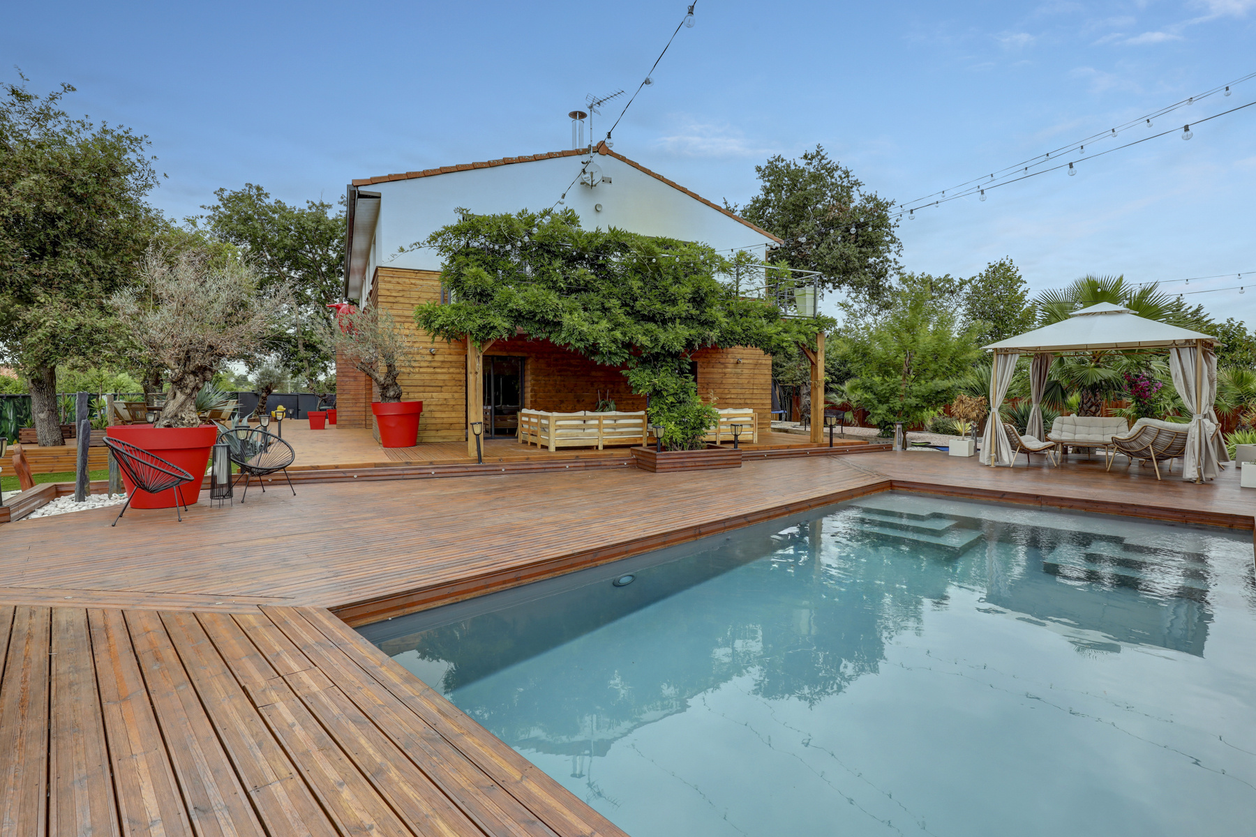 À l’extérieur, vous profiterez d’un jardin entièrement paysagé, de magnifiques terrasses tout autour de la maison permettant de choisir entre ombre et soleil tout au long de la journée. Le tout est complété par un pool-house exceptionnel avec cuisine d’été, espace repas convivial, et une piscine idéalement exposée.