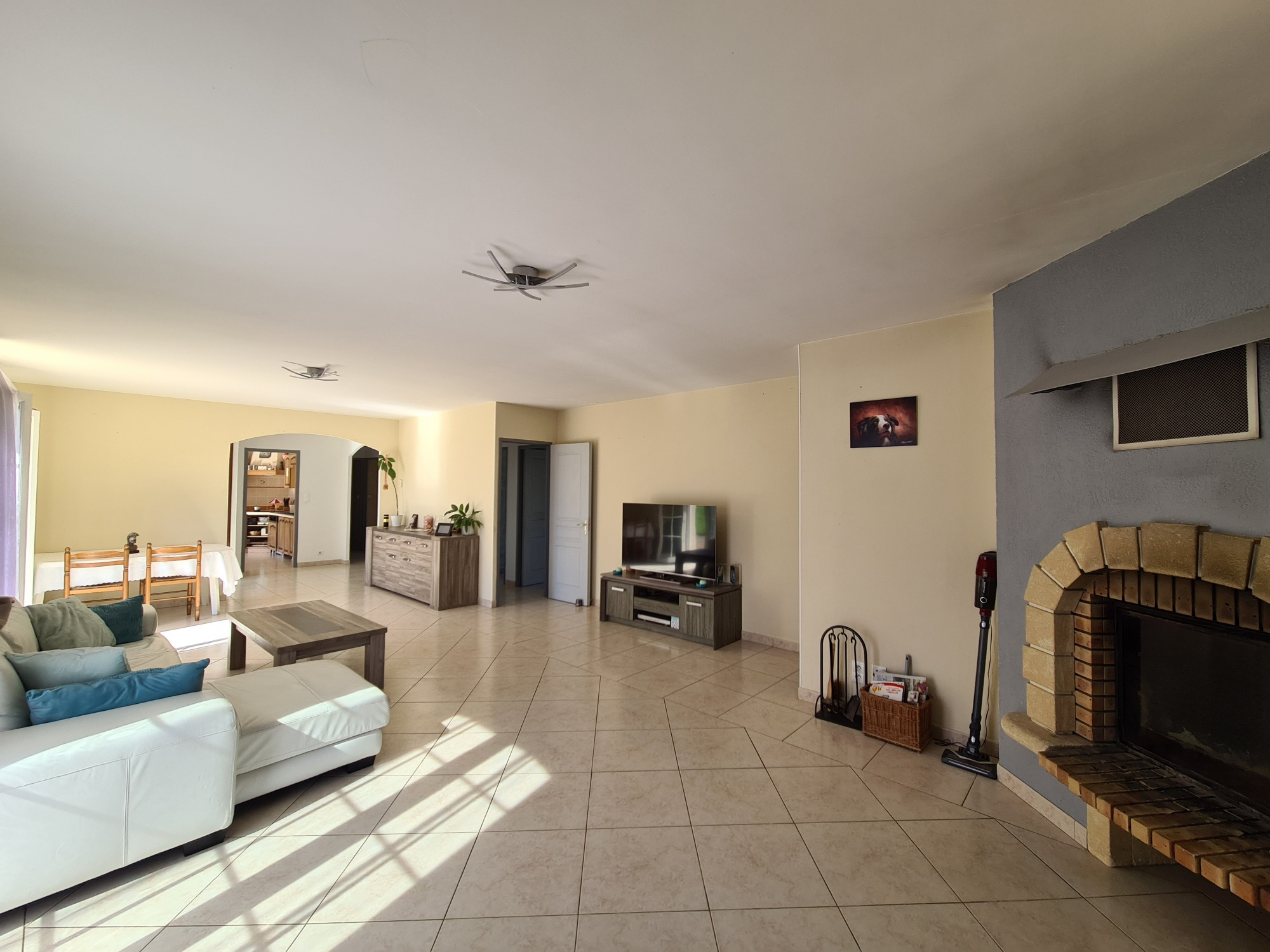 Elle se compose d’un beau séjour lumineux de 40 m² avec cheminée, offrant un espace convivial donnant accès à une large terrasse avec vue sur le jardin et la piscine.