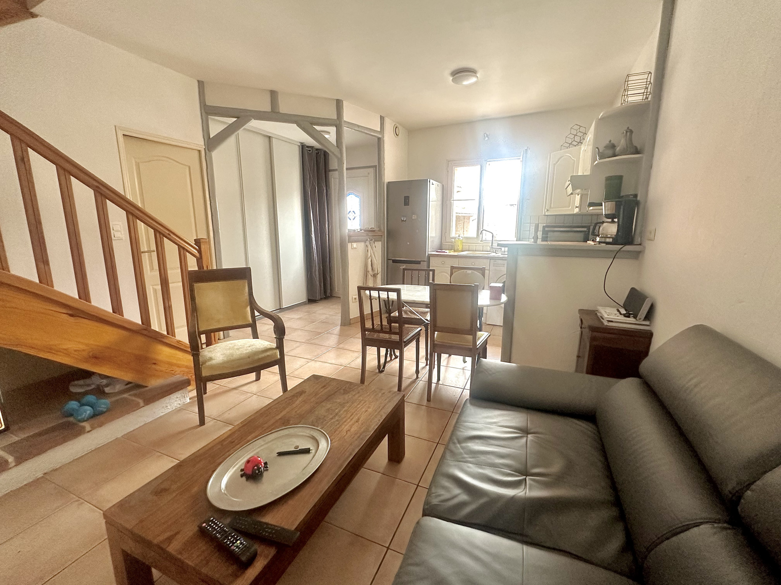 Entrée avec grand placard, pièce à vivre avec cuisine équipée ouverte et WC séparés.