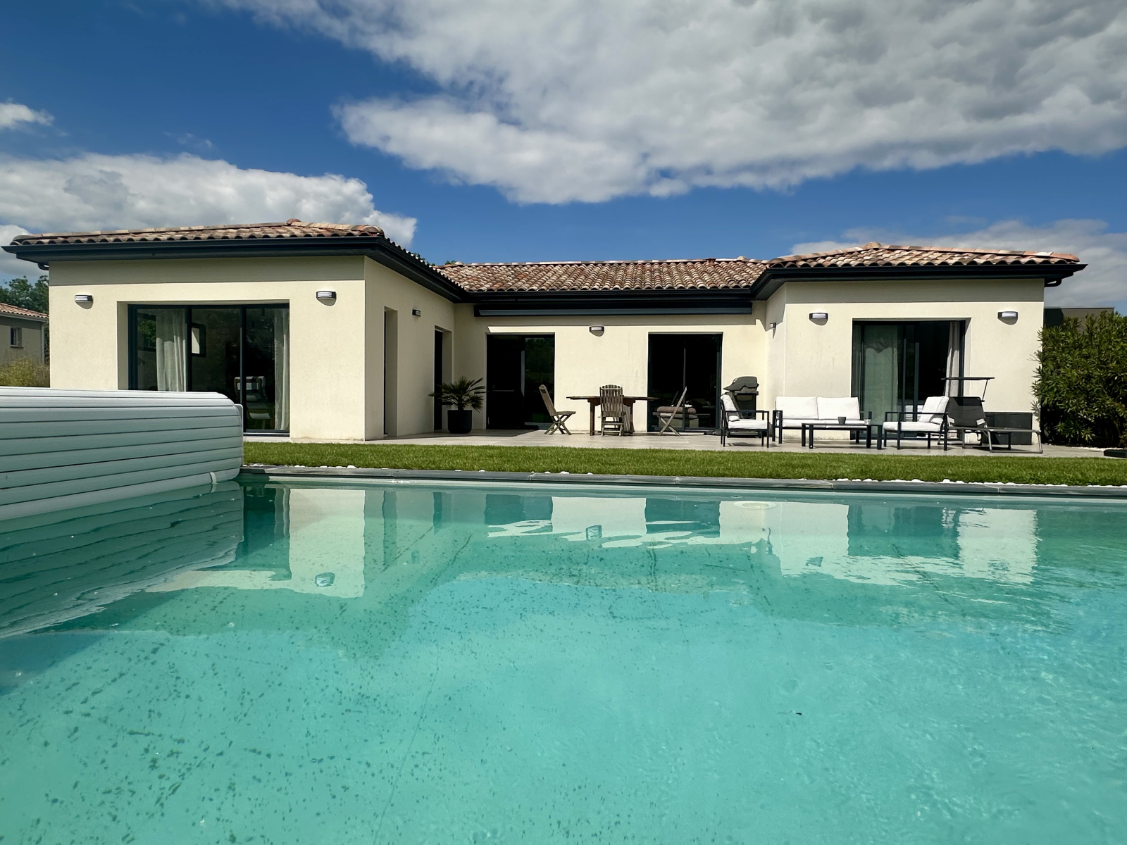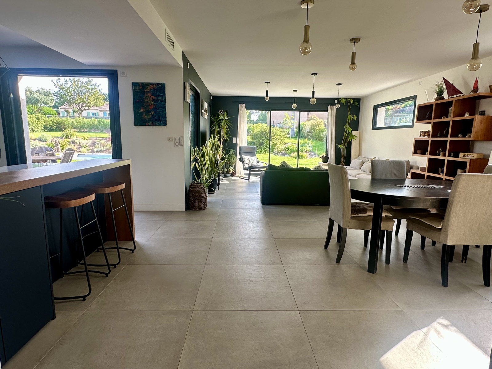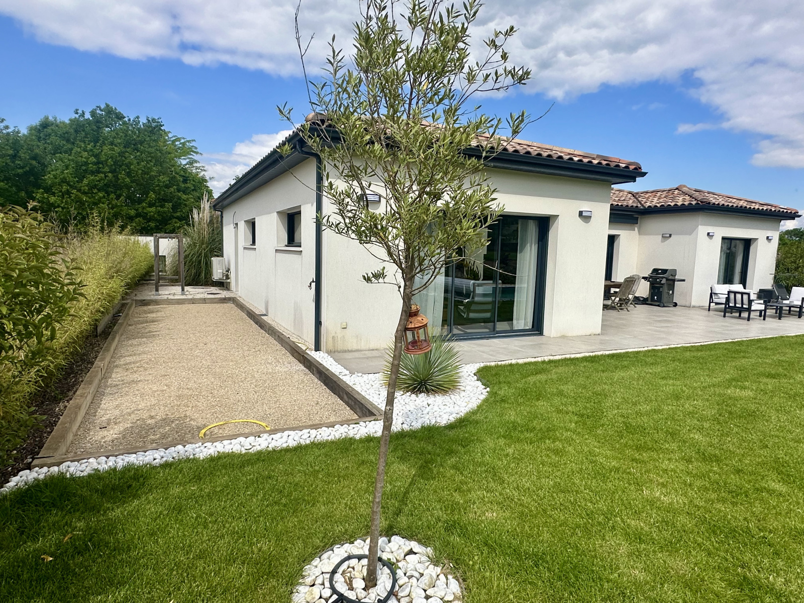 À l’extérieur, le jardin soigneusement aménagé accueille une terrasse carrelée de 50 m² exposée plein sud, une piscine au sel parfaitement intégrée, et un terrain de pétanque pour des instants de convivialité.