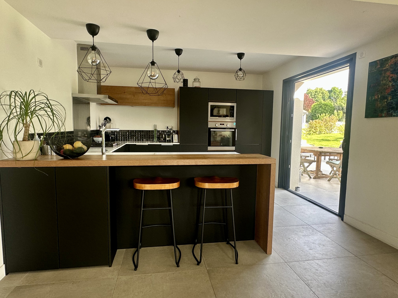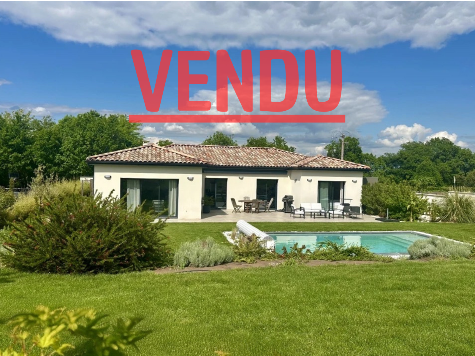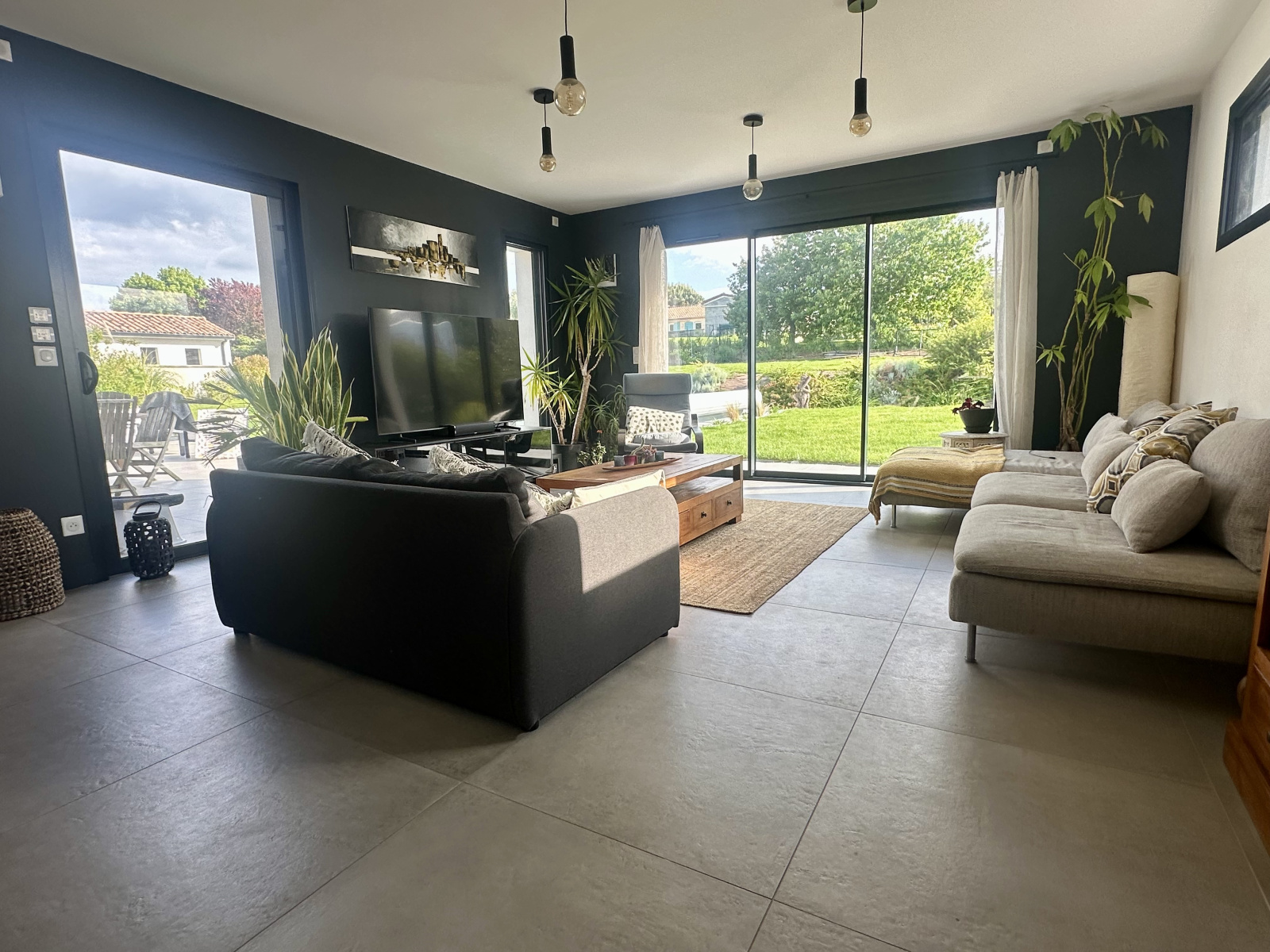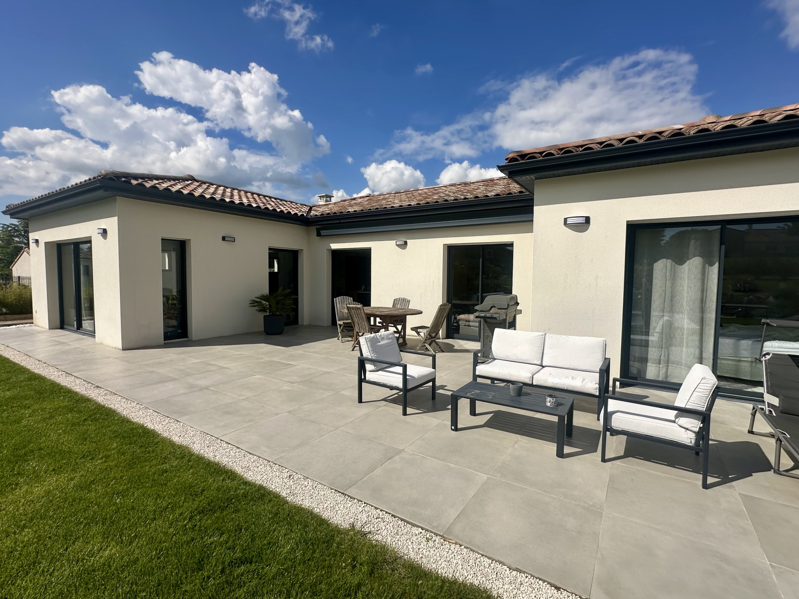 À l’extérieur, le jardin soigneusement aménagé accueille une terrasse carrelée de 50 m² exposée plein sud, une piscine au sel parfaitement intégrée, et un terrain de pétanque pour des instants de convivialité.