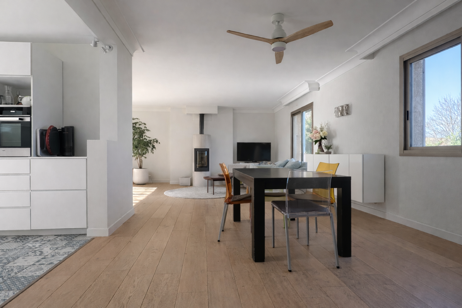 Dès l’entrée, vous découvrirez un hall accueillant avec un grand placard de rangement. L’espace de vie traversant d’environ 50 m² séduit par sa luminosité et son poêle à bois, offrant une atmosphère chaleureuse. Il comprend une cuisine équipée ouverte et s’ouvre directement sur une terrasse couverte, idéale pour profiter de la vue dégagée sur le jardin.