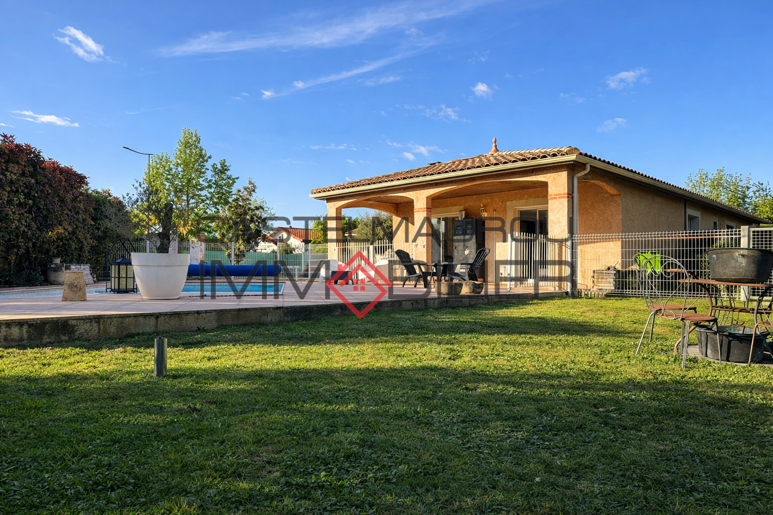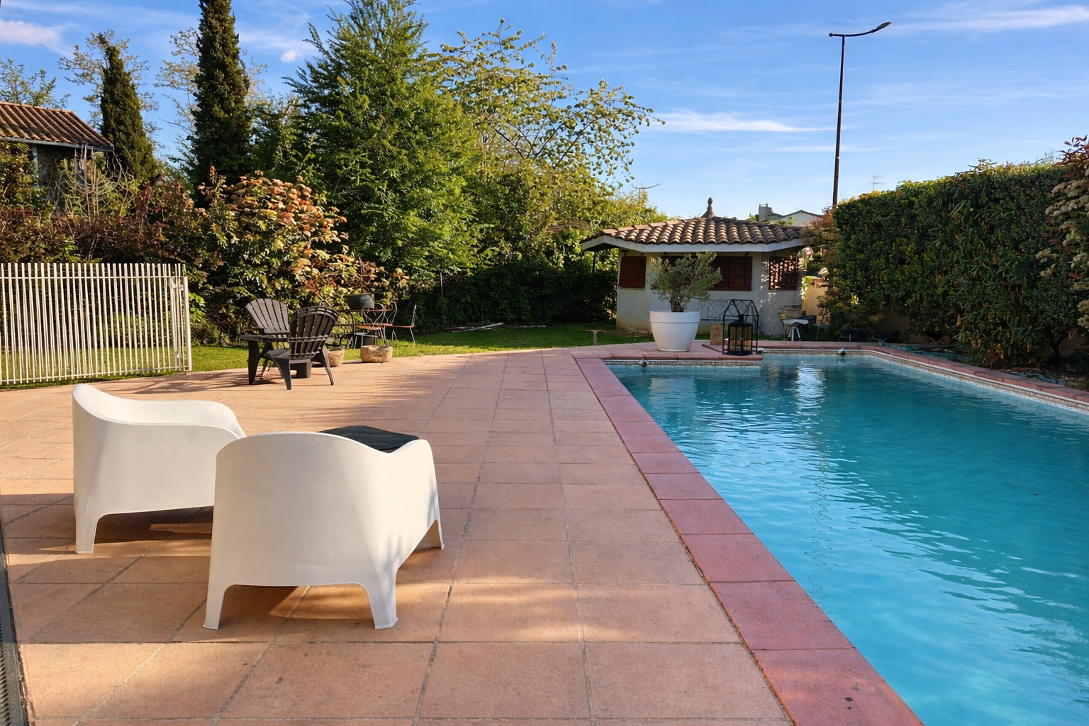La maison propose une belle terrasse couverte et un espace piscine idéalement exposé, dans le prolongement direct de la pièce de vie, offrant un cadre de vie convivial.