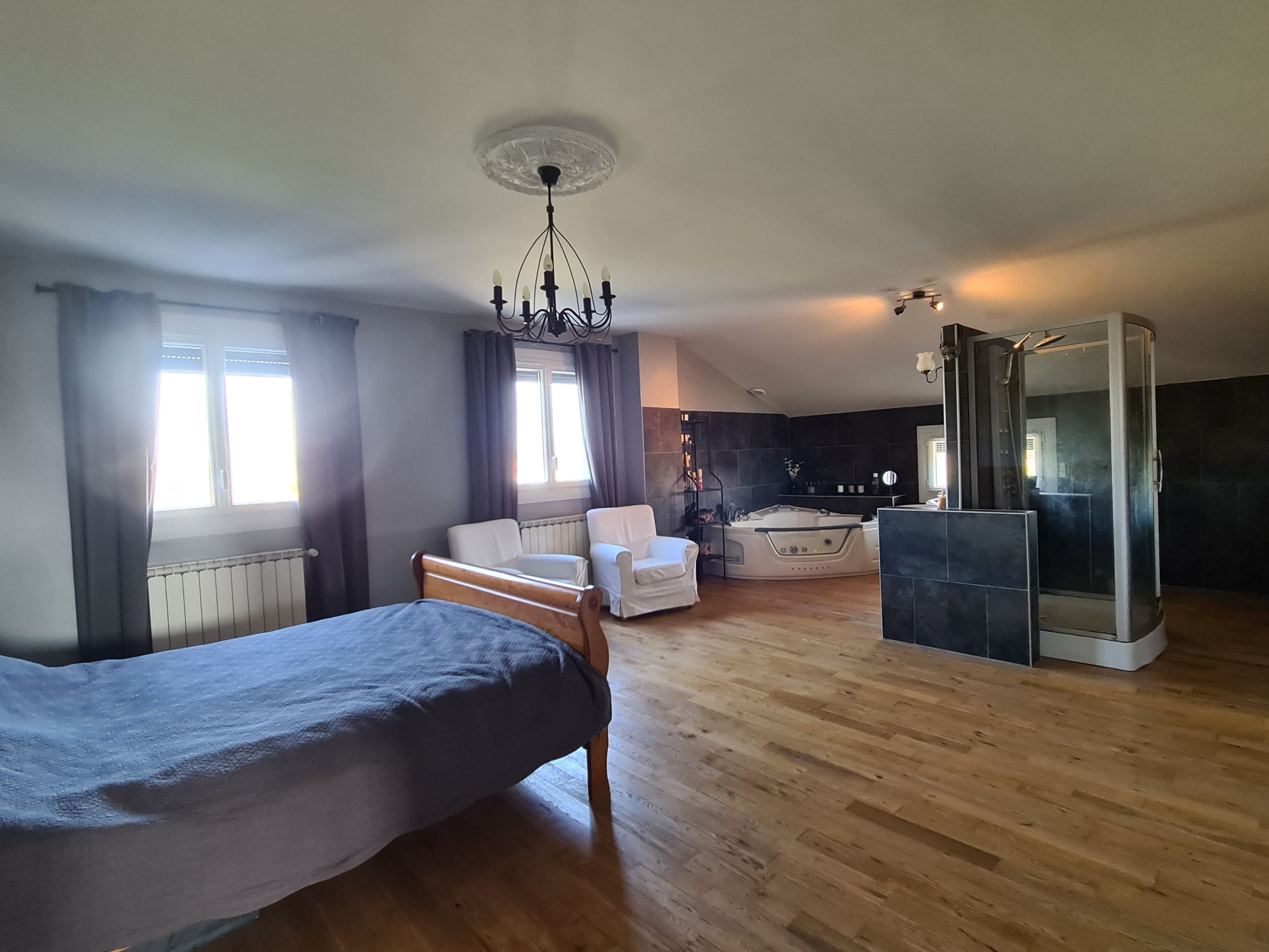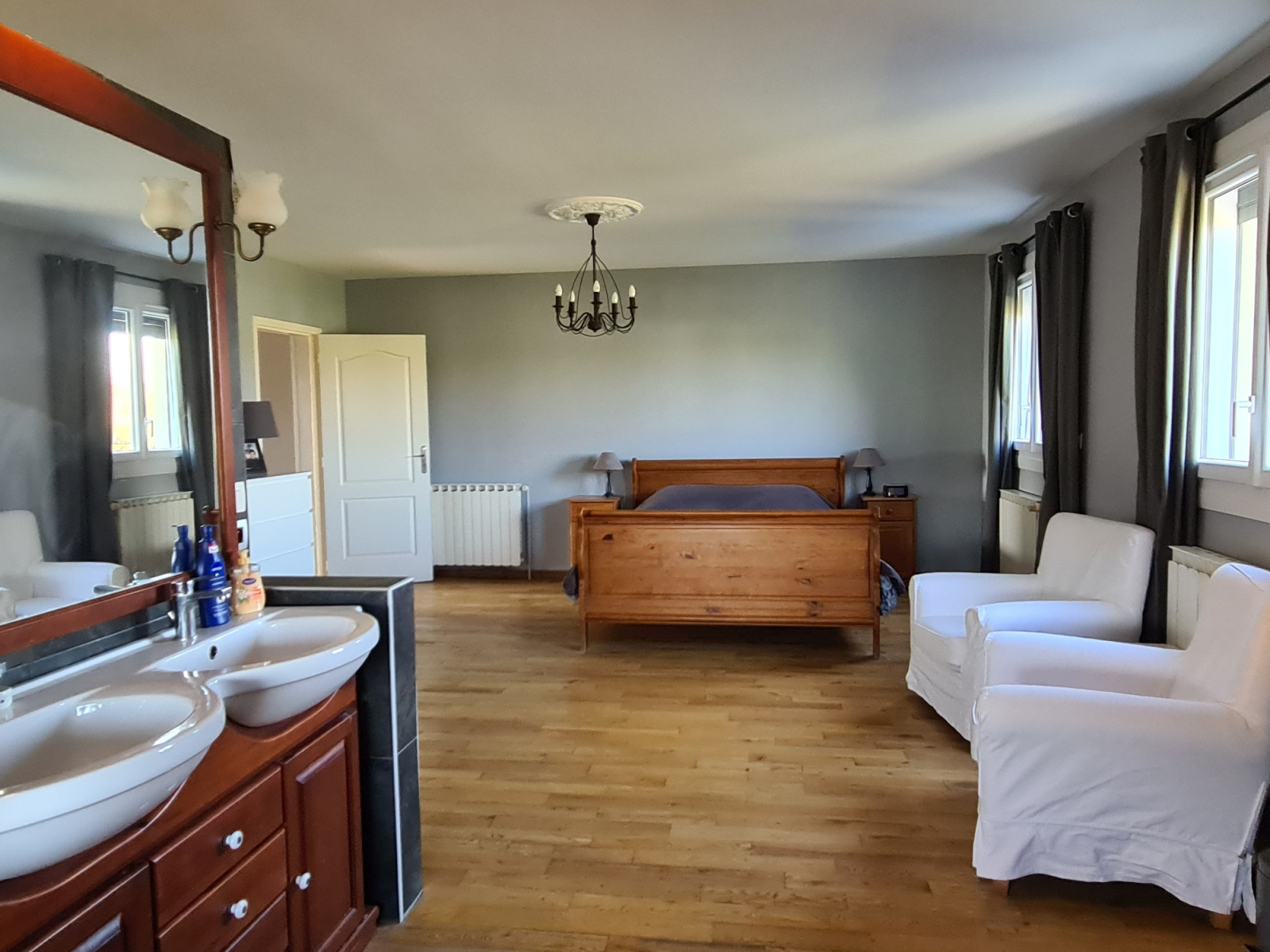 À l’étage, l’espace nuit accueille cinq chambres, dont une suite parentale aux dimensions remarquables, disposant de sa salle de bain privative et d’une pièce indépendante dédiée au dressing.