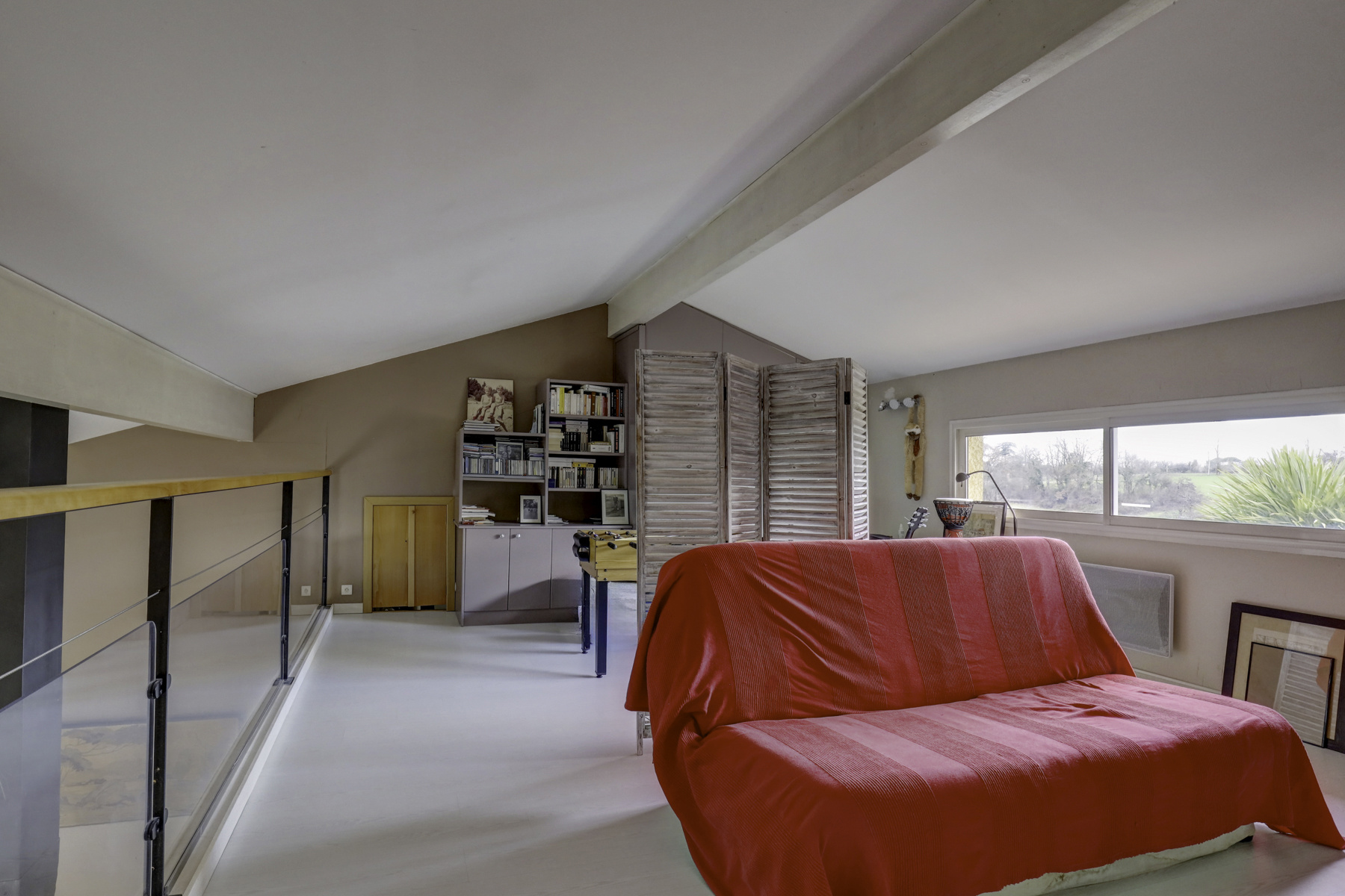 À l’étage, l’espace nuit se compose de trois chambres avec placards, d’une salle de bain équipée d’une baignoire et WC, ainsi que d’une agréable rochelle d'environ 30 m² offrant un espace supplémentaire polyvalent (bureau, coin lecture, salle de jeux).