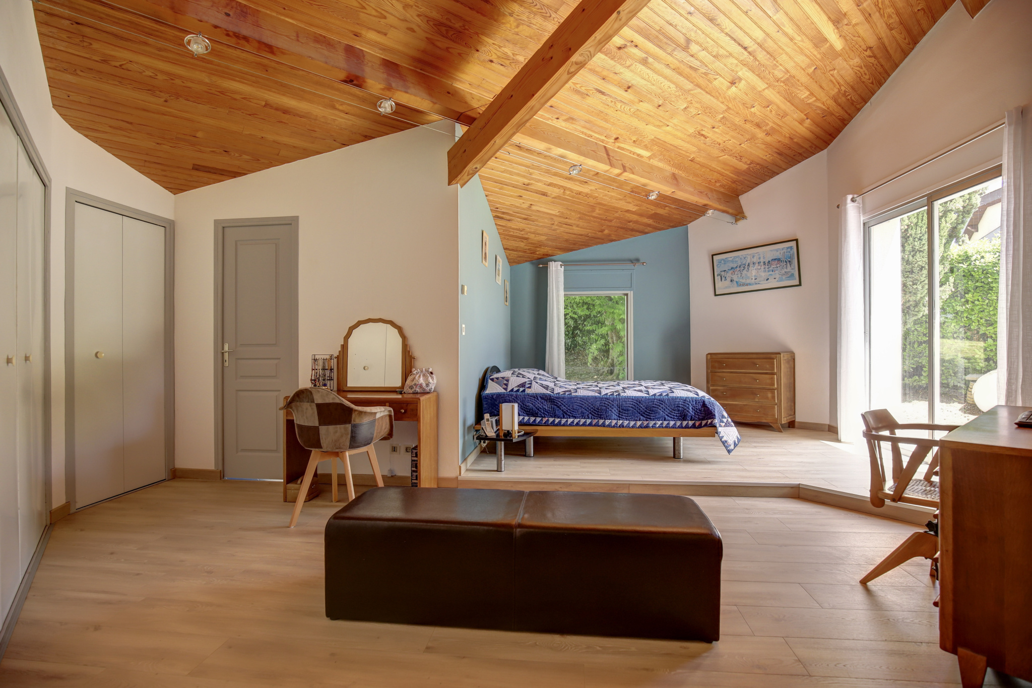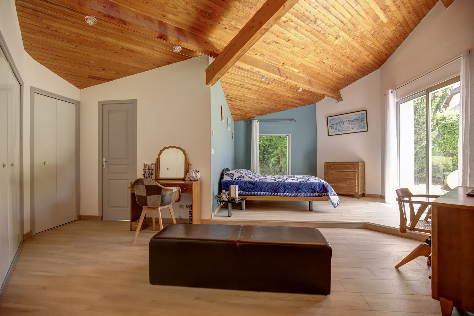L'espace nuit se compose de trois chambres, dont une avec mezzanine, d’une pièce polyvalente pouvant faire office de salle de jeux ou de bureau, ainsi que d’une salle de bain avec douche à l’italienne et double vasque. De plus, vous découvrirez la suite parentale de 40 m² qui dispose de nombreux rangements, d’une salle de bain avec baignoire balnéo avec vue sur la piscine et d’un sauna.