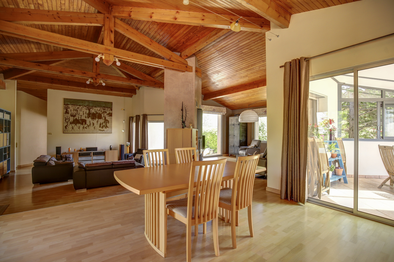 Dès l’entrée, découvrez une vaste pièce de vie lumineuse et déplafonnée de 85 m², composée d’un salon chaleureux avec double cheminée, et d’une cuisine ouverte entièrement équipée. Cette pièce donne sur une véranda utilisable toute l’année, offrant une continuité naturelle vers l’extérieur.