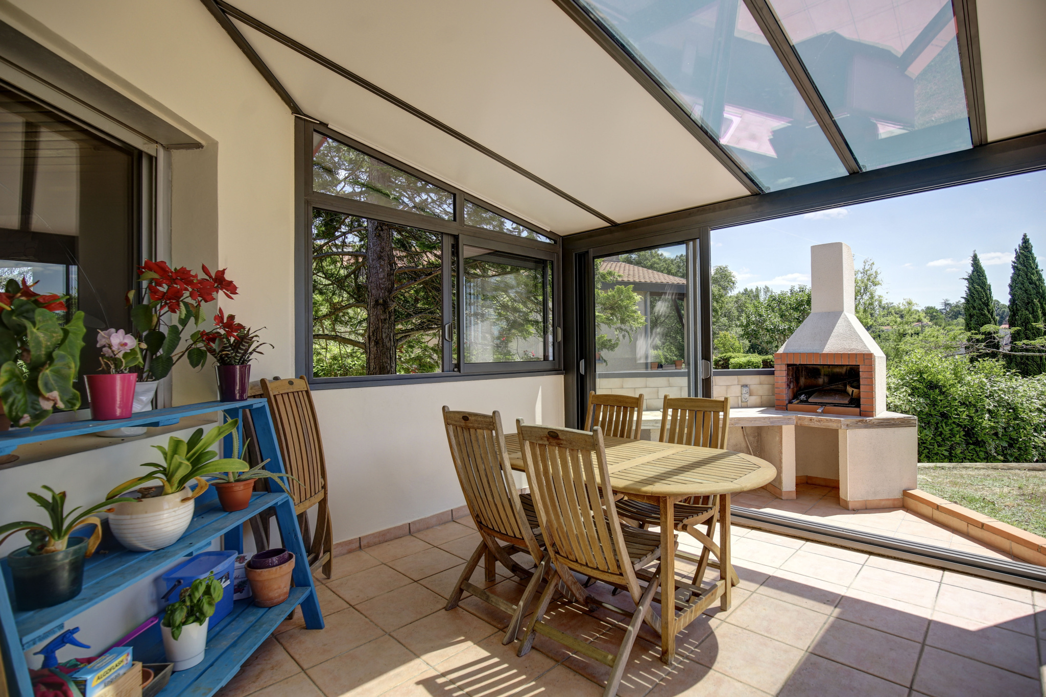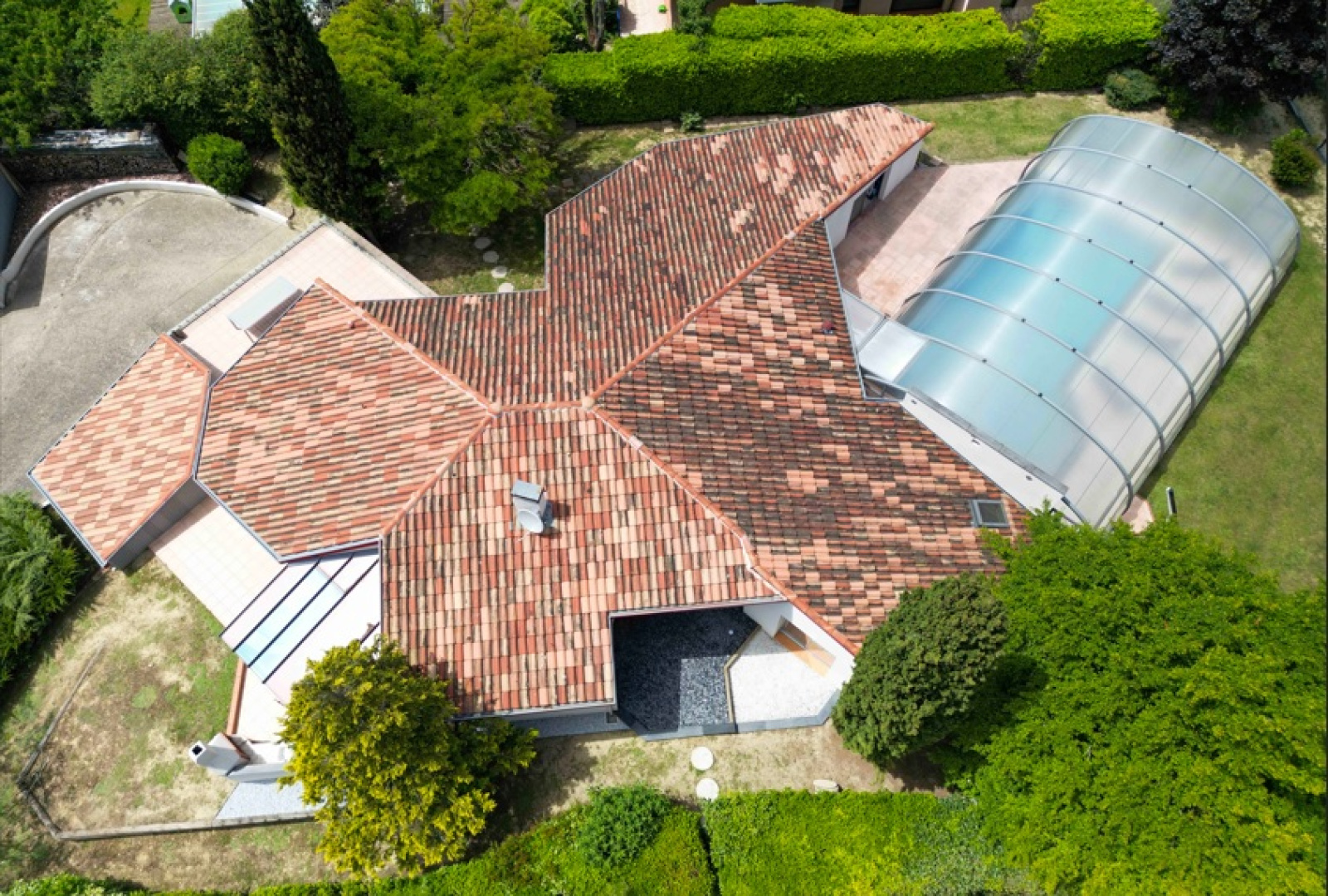 À l’extérieur, vous bénéficierez d’une grande terrasse bien exposée, à l’abri des regards, et d’un espace piscine couvert exceptionnel avec pool-house, cuisine d’été et vue dégagée sur la campagne environnante.