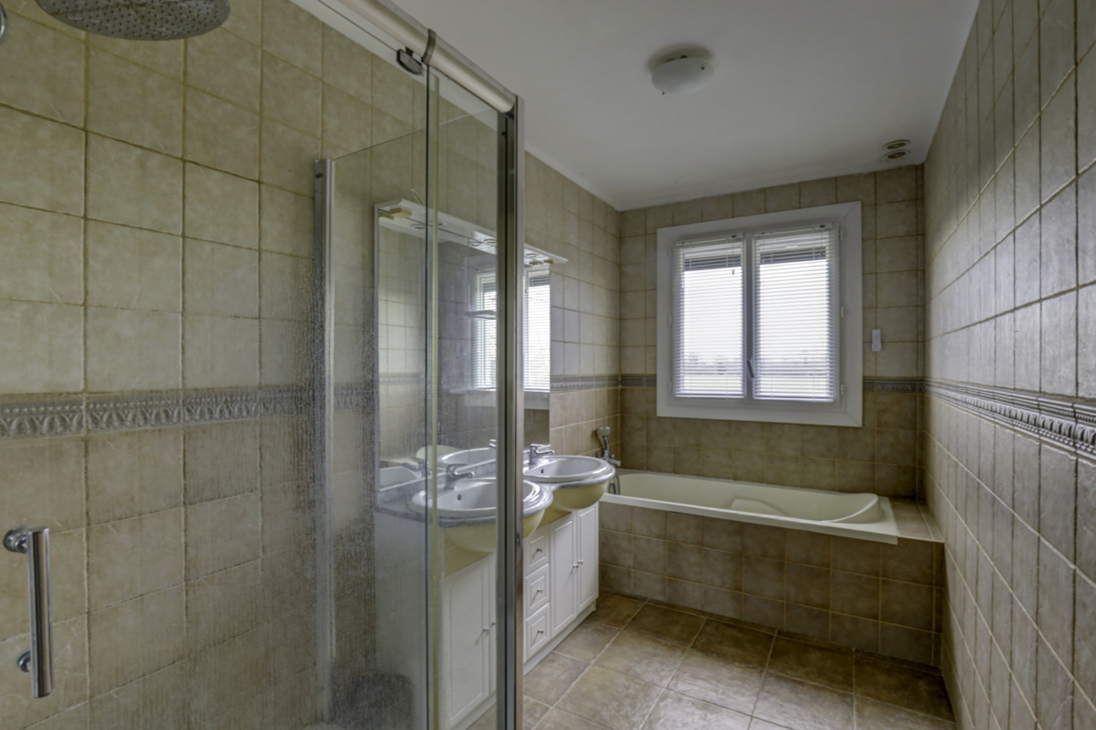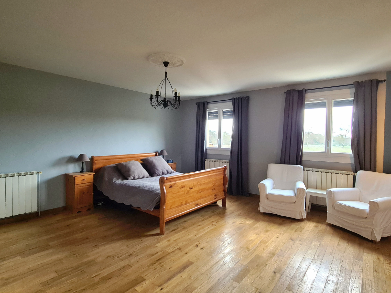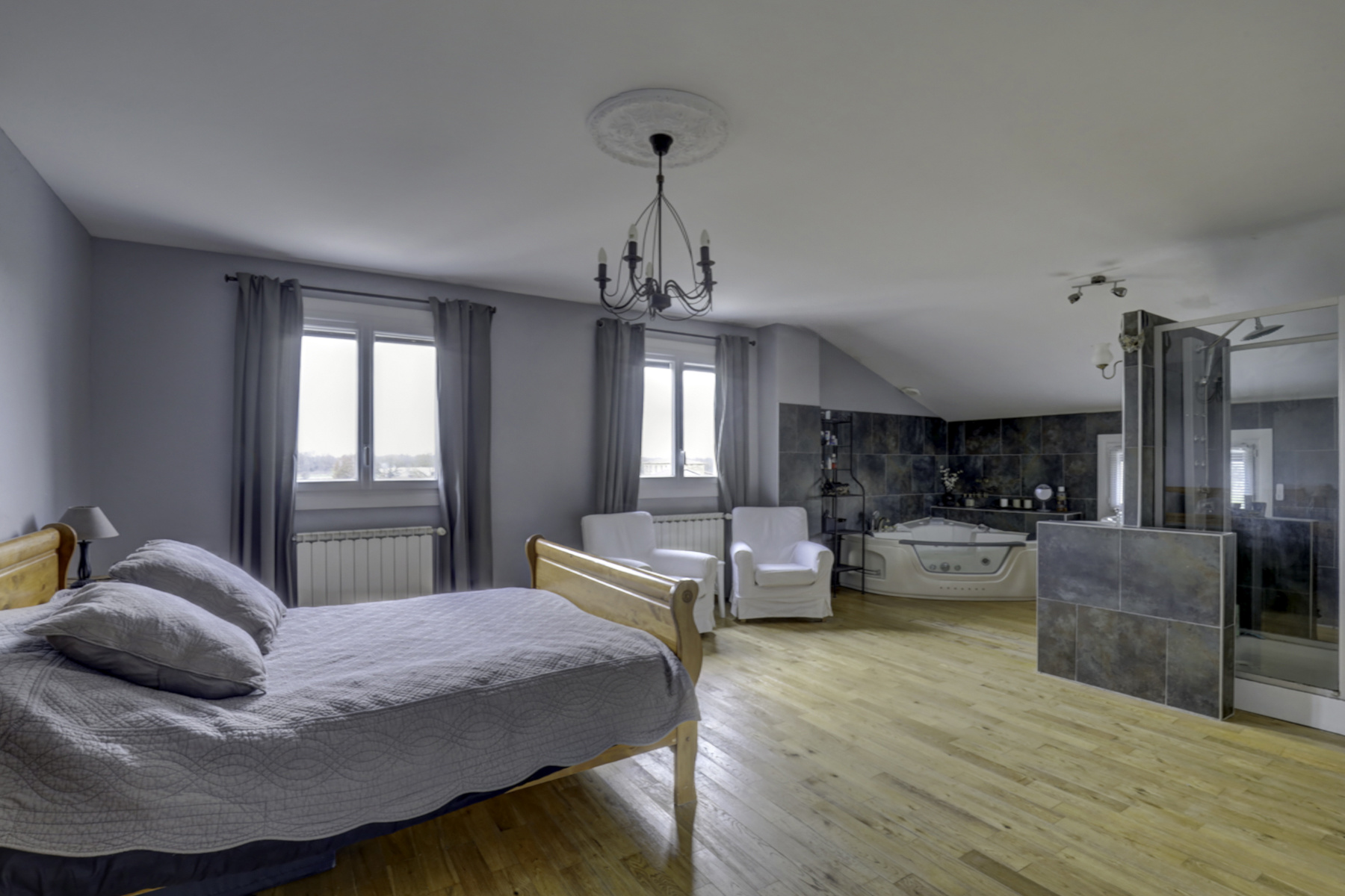 À l’étage, l’espace nuit accueille cinq chambres, dont une suite parentale aux dimensions remarquables, disposant de sa salle de bain privative et d’une pièce indépendante dédiée au dressing.